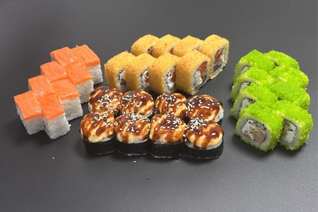 Вес 1200 гр. 40 шт. Состав:Филадельфия Классик,Запеченный Унаги Хотто,Запеченный Гриль,Калифорния Рэд,Темпура Фиш.Внимание!(цвет икры может меняться).