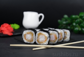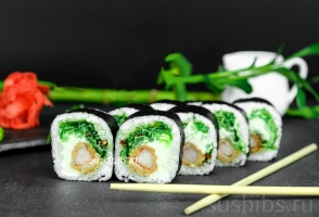 Вес: 305/190 гр. Ролл обёрнутый в нори с начинкой из чука салата и тигровой креветкой в кляре.