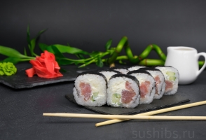 Вес: 300/240 гр. Нежное филе тунца, тающая мягкость сливочного сыра со свежим огурчиком обёрнутого в нори.