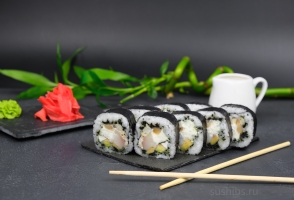 170 гр. Классические роллы Маки со сливочным сыром и филе копченного Эсколара.