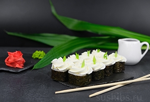 Вес:275/220 Мидии в соусе терияки,зеленый лучок ,нори,рис,сливочный сыр.