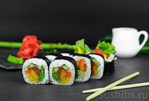 Вес: 270/210 гр. Ролл в нори с рисом ,свежим огурчиком, нежным листом салата Айсберг, болгарским перчиком и свежим томатом.