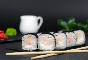 Вес 170 гр.Классические роллы Маки со сливочным сыром и филе копчённой курочки.