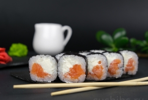 Вес 170 гр.Классические роллы Маки со сливочным сыром и филе лосося.