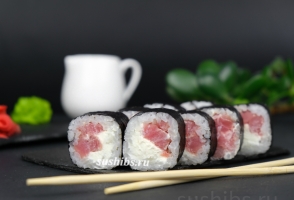 Вес 170 гр.Классические роллы Маки со сливочным сыром и филе Тунца.