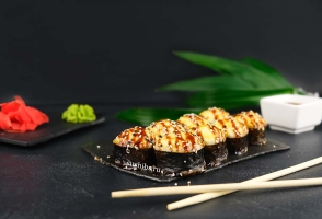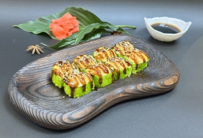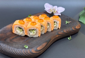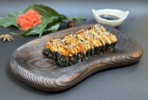 Вес 285 гр. Нежнейший запеченный ролл с лососем и тигровой креветкой,в икре масаго сливочным сыром с аппетитной сырной шапочкой политой соусом унаги.