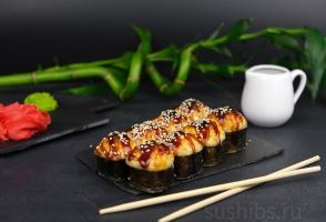 Вес 275 гр. Нежнейший запеченный ролл с филе лосося , крабом(сурими),в икре масаго сливочным сыром с аппетитной сырной шапочкой политой соусом унаги.