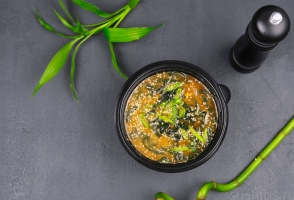 Состав:450 мл.Бульон Ким Чи,Куриная грудка, водоросли Вакаме,Яйцо,лук ,кунжут