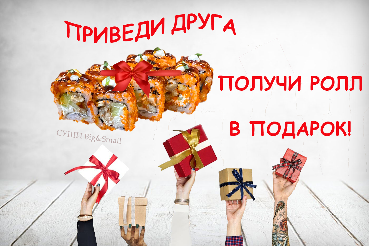 Количество приведённых друзей неограниченно. Условия акции: Если ранее Вы не были нашим клиентом - для участия в акции Вы должны совершить хотя бы одну покупку в Суши Big&Small.Для выполнения условий акции - друг, который обращается в Суши Big&Small, должен сообщить, что о нас узнал по Вашей рекомендации и сообщить нам Ваш номер телефона.Если Ваш друг отказался от получения заказа - Ролл в подарок не предоставляется. Ваш друг, который обратился в Суши Big&Small по Вашей рекомендации так же может участвовать в акции,рекомендовать Суши Big&Small своим друзьям и т.д. Персональная скидка так же предоставляется (Акция действует при самовывозе).Подробности акции узнавайте у оператора!