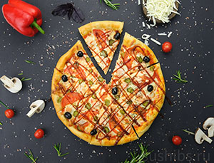 Вес: 1340/955/1055 гр. Томатный соус, свежие помидоры, маринованные корнишоны, лук,копченый цыплёнок, маслины,сыр Моцарелла и конечно же соус Барбекю.