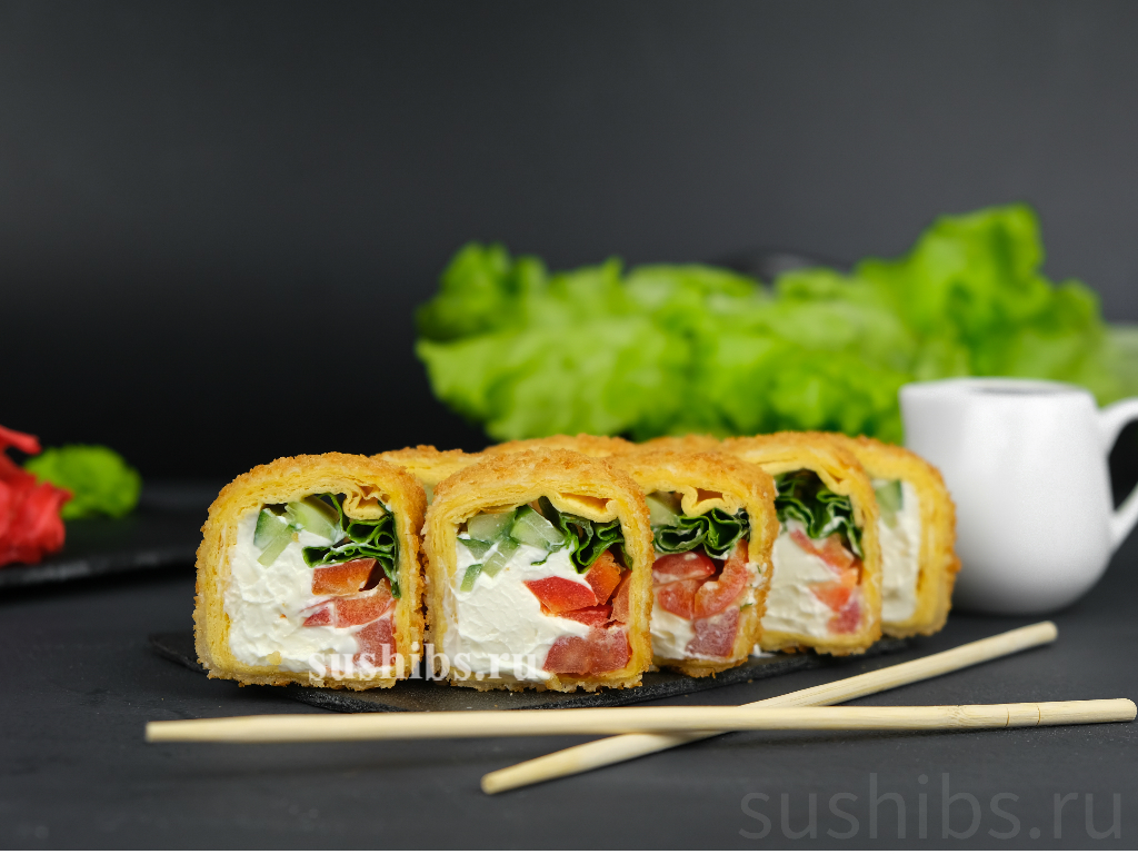 Вес:210 гр. Обжаренный во фритюре ролл в тартилье,сливочный сыр и овощной микс (огурец, лист салата Айсберг, перец болгарский,помидор,)