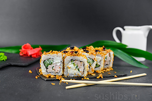 Вес 320/225 гр. Копченая курочка,в сочетании с нежным сливочным сыром,свежим огурчиком и пикантным зеленым лучком.Украшен хрустящим луком фри и соусом унаги.