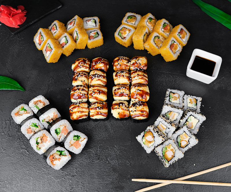 48 шт.Вес 1350 гр.Запеченный Фиш,Окинава, Пиканто,Темпура Сяке,Запеч чесночный с Курицей ФРИ ,Темпура Бекон ФРИ