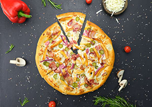 1245/890/990 гр. Авторское тесто с нежным фирменным белым соусом, и начинкой из венгерского бекона, хрустящих корнишон, картофеля фри, красного лука и оригинального сыра mozzarella.