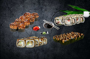 Вес 930 гр.32 шт. Состав:Холодный ролл с копченой грудкой,Холодный ролл с морским окунем,Запеченный ролл с угрем,Темпура с угрем (Внимание,только самовывоз!)
