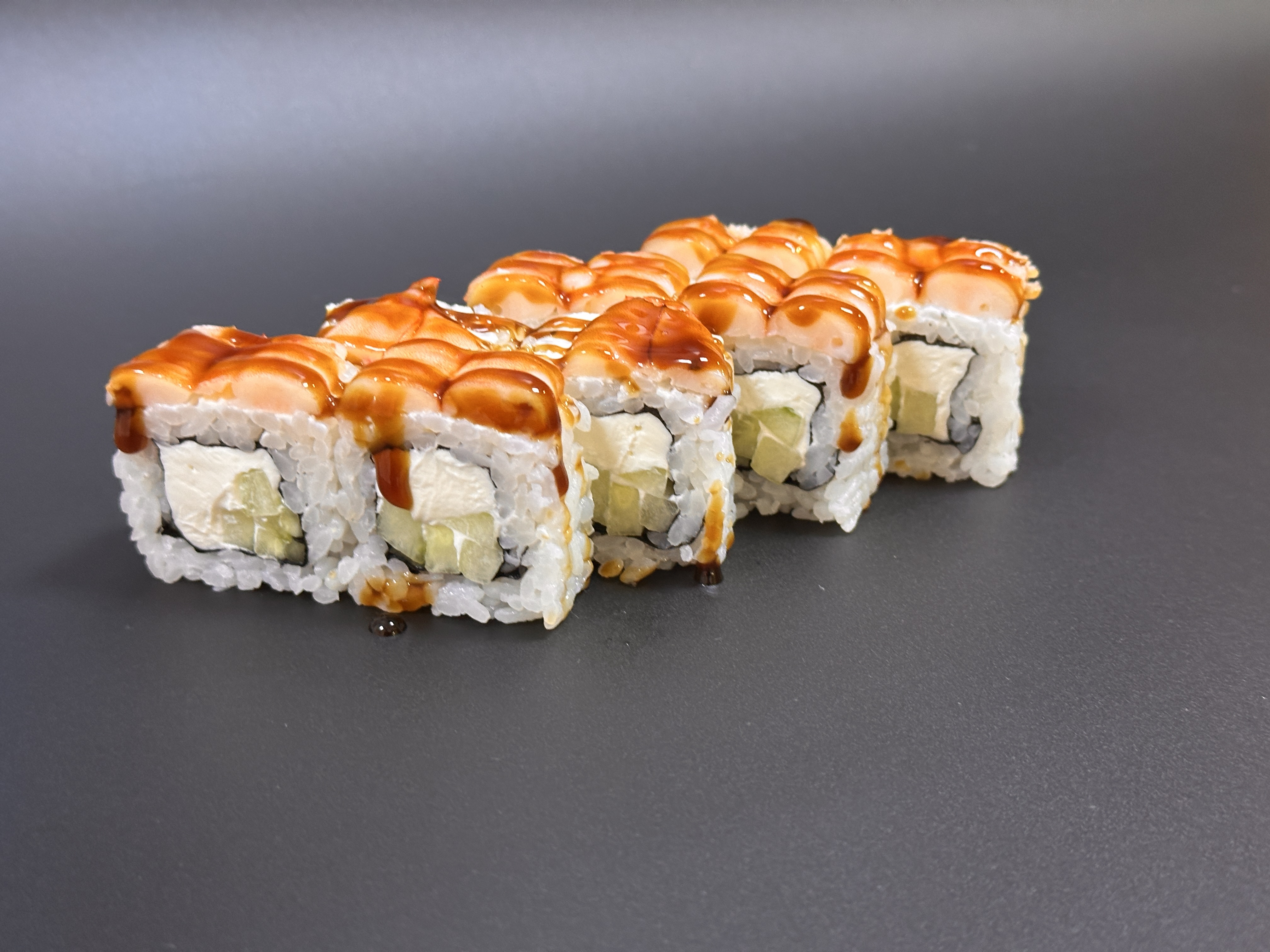 Эби Лайт (Small) Вес: 235 гр. Ролл с нежным сливочным сыром, свежим огурчиком и рисом, обернутый в нори. Креветка, расположенная сверху, придаёт блюду дополнительную текстуру и вкус. Политый соусом унаги, этот ролл предлагает сладко-солёное дополнение к классическим ингредиентам, создавая гармоничный баланс вкусов.