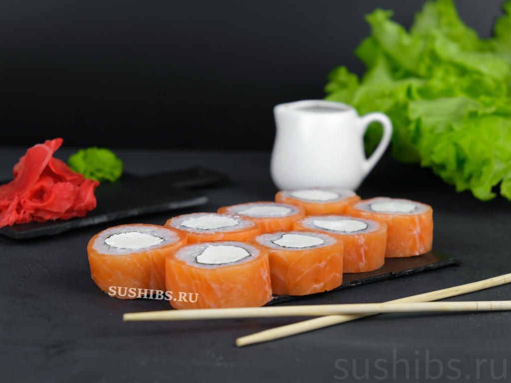 Вес: 380/270 гр+-%. Мега ролл из нежного лосося и огромного количества лёгкого сливочного сыра.