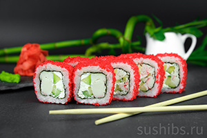 Вес: 315/210 гр. Классический ролл с авокадо, сливочным сыром, с сурими (имитация снежного краба). Покрыт яркой икрой летучей рыбы. (цвет может меняться).