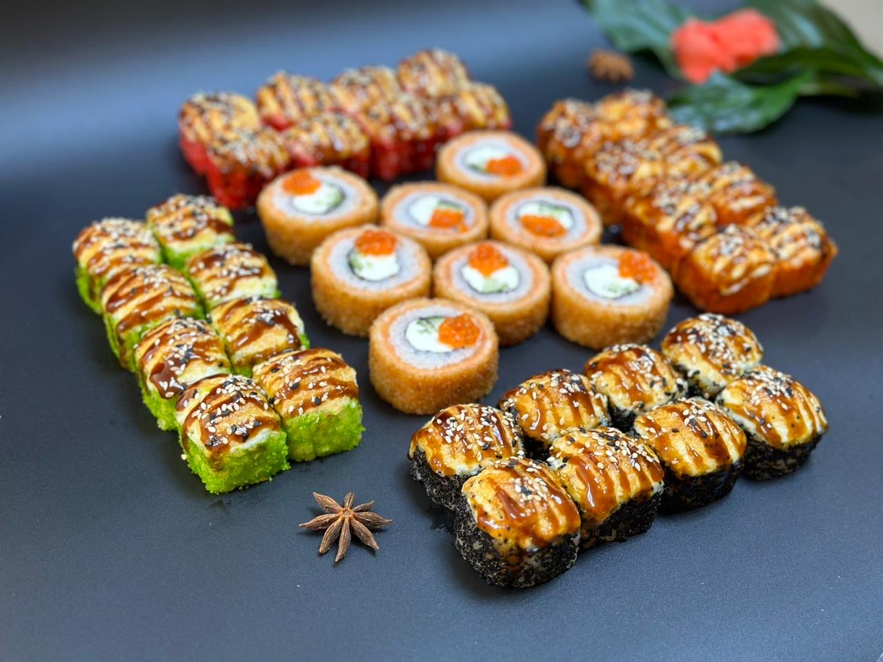40 шт.Вес 1500 гр.Самый нежный сет! Запеченный Гонконг,Запеченный Грин,Запеченный Каскад ,Запеченный Сёгун ,Филадельфия Темпура Макси.Внимание!(цвет икры может меняться).