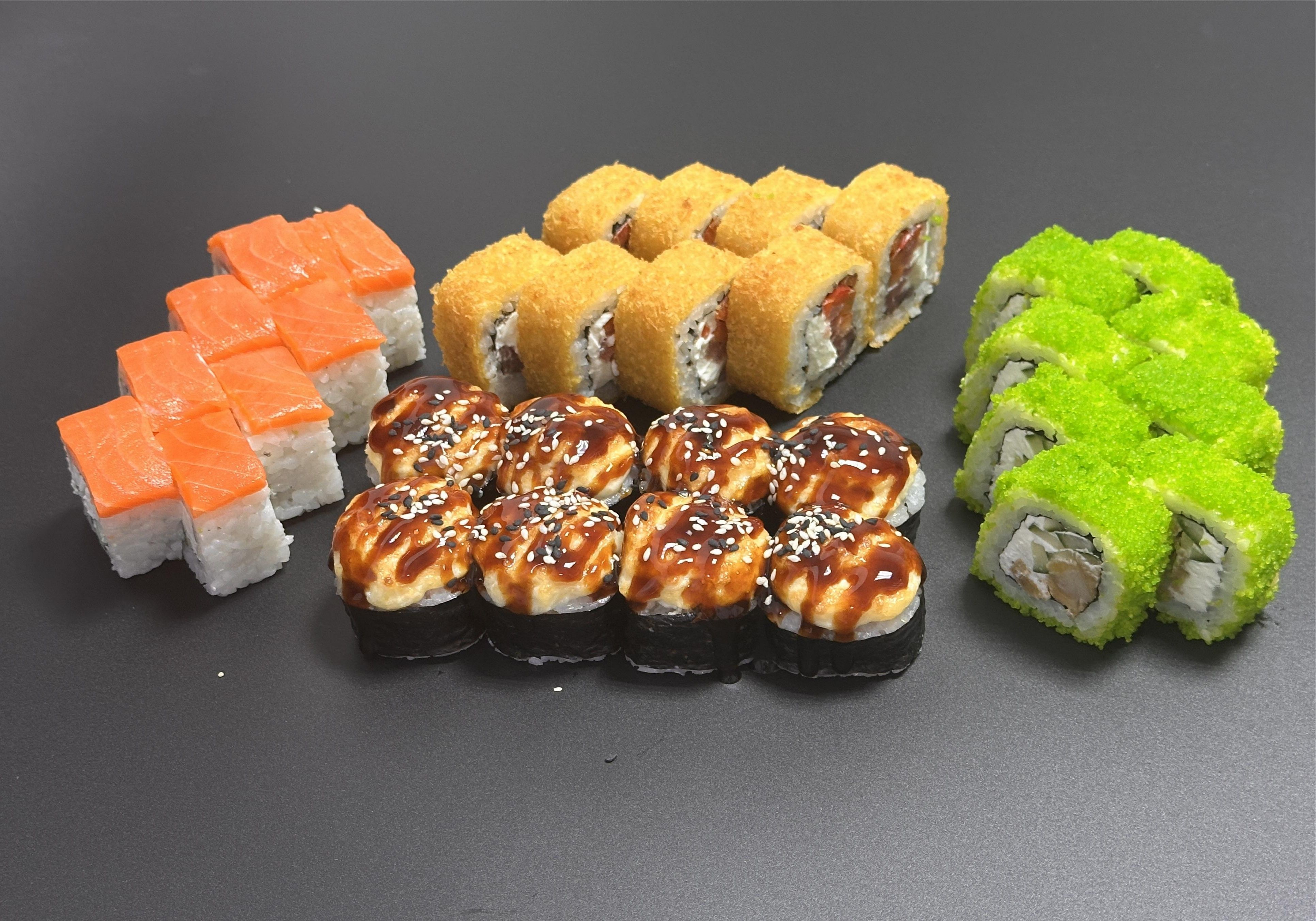 32 шт. Вес 1 кг Состав: Филадельфия Лайт, Грин Фиш,Запеченный с крабом,Темпура Магуро.