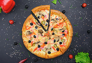 1170/770/870 гр. Настоящая Веганская пицца (специальное тесто без яиц) Состав: Красный соус, Помидор, Корнишоны, Болгарский Перец, Лук красный, Шампиньоны, Маслины, Моцарелла.