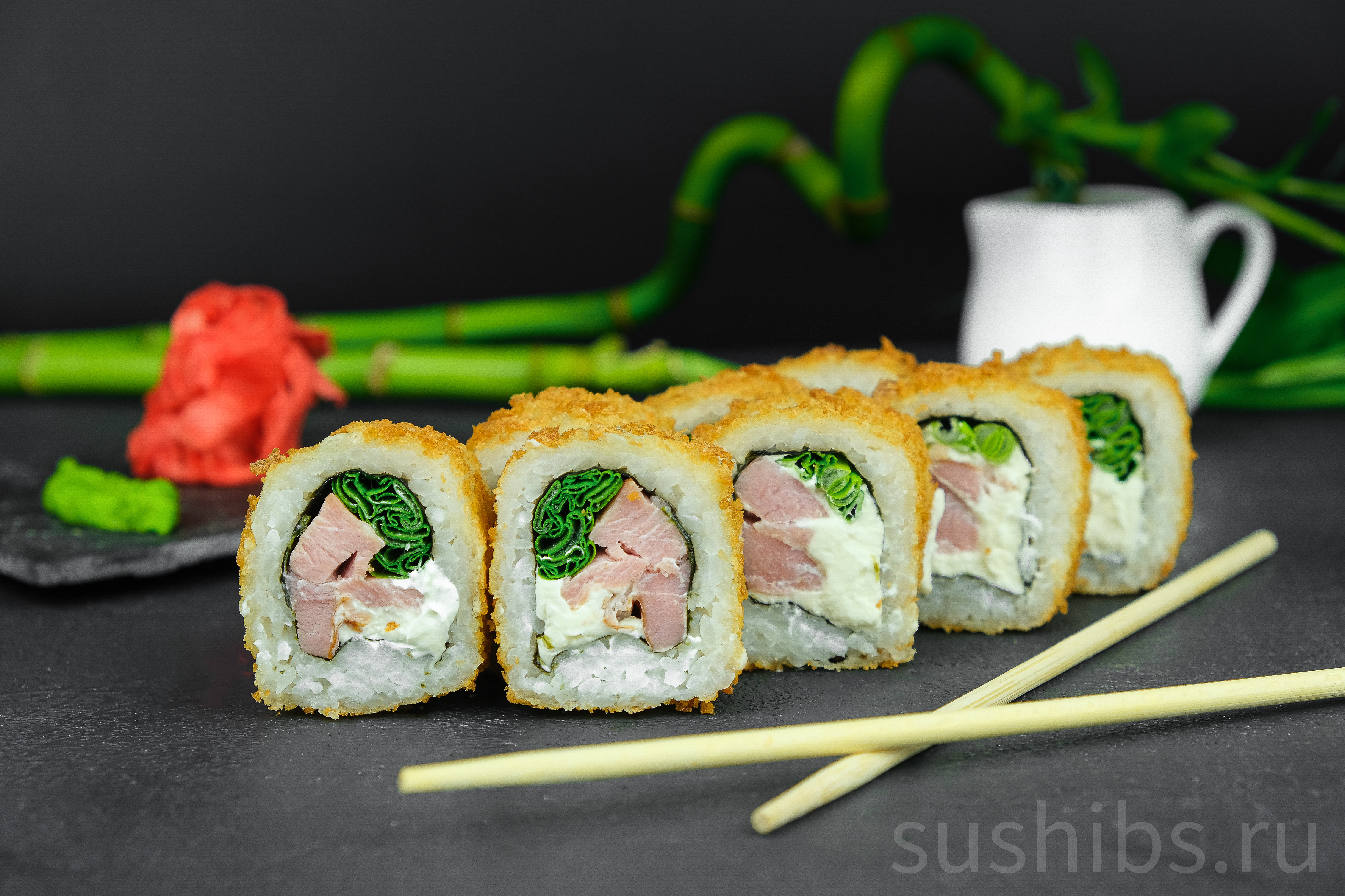 Вес: 320/240 гр. Фри-ролл с копченым беконом, нежным сливочным сыром и зеленым лучком.