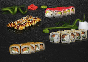 32 шт.Вес 885 гр.Состав:Калифорния Лайт,Бостон,Запеченный Фиш,Темпура Сяке.Внимание!(цвет икры может меняться).