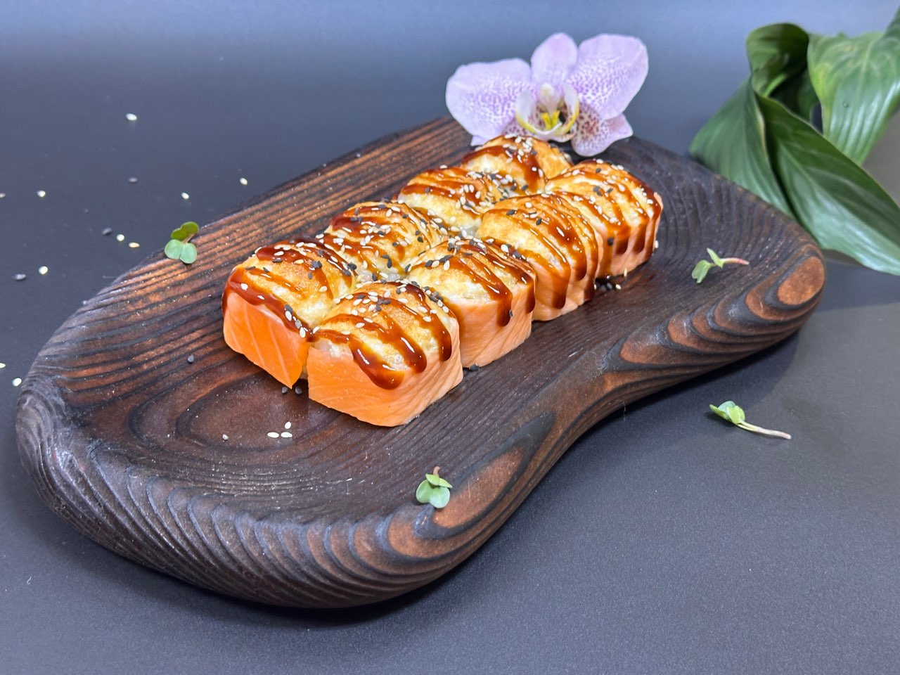 340 гр..Запеченная Филадельфия под сырной шапкой с нежным филе лосося с верху ,со сливочным сыром, хрустящим огурчиком полита соусом унаги.