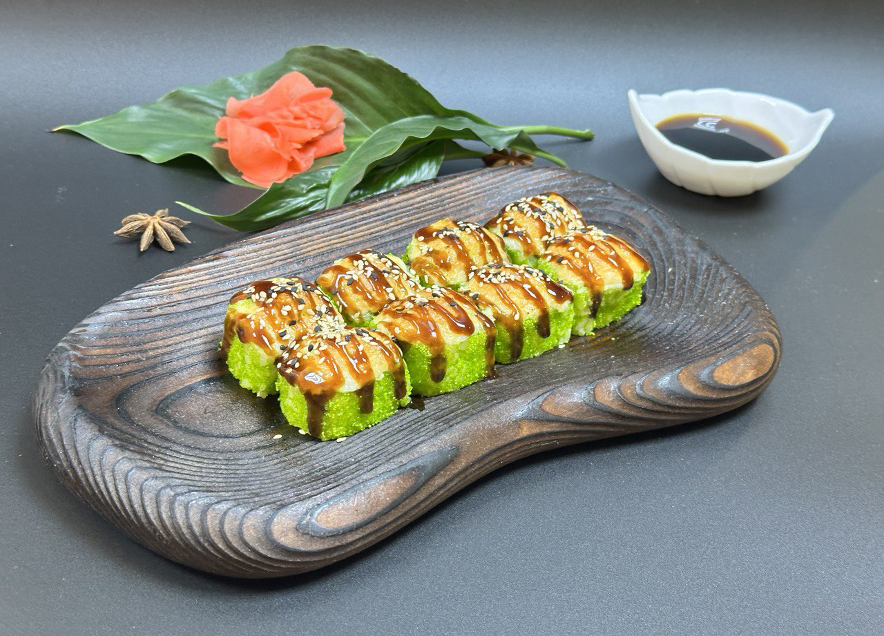 Вес 275 гр. Нежнейший запеченный ролл с копченым угрем и тигровой креветкой,в икре масаго сливочным сыром с аппетитной сырной шапочкой политой соусом унаги.