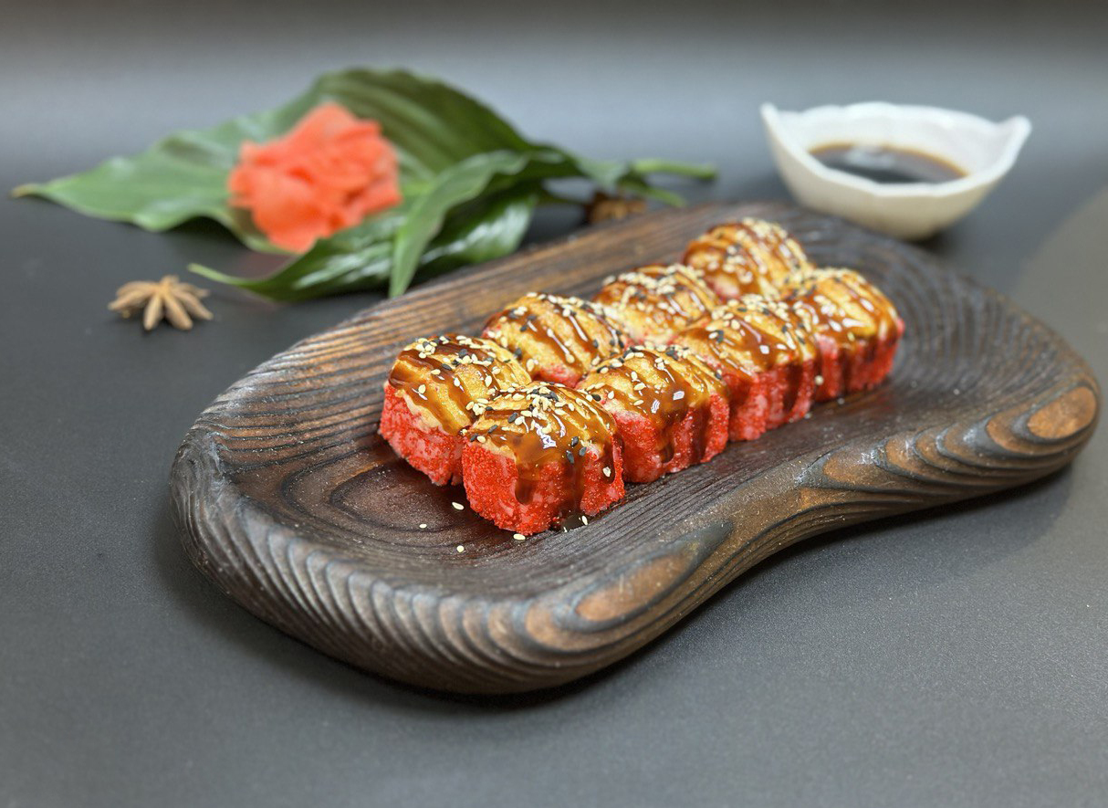Вес 275 гр. Нежнейший запеченный ролл с копченым угрем и филе лосося ,в икре масаго сливочным сыром с аппетитной сырной шапочкой политой соусом унаги.