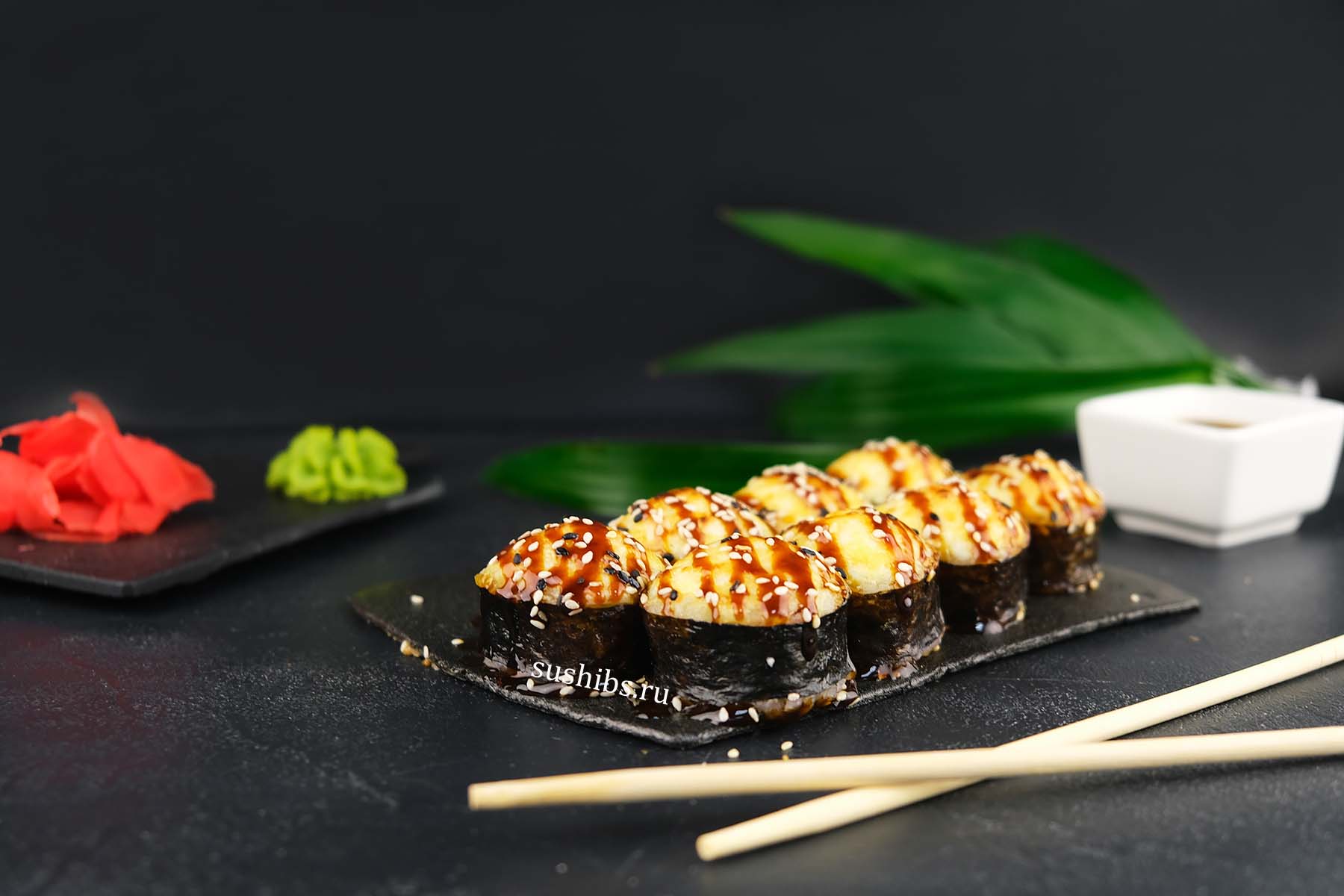 Вес: 420/265 гр. Запеченный ролл под сырной шапкой с курочкой Фри , лучком, сливочным сыром, хрустящим огурчиком и японским омлетом.