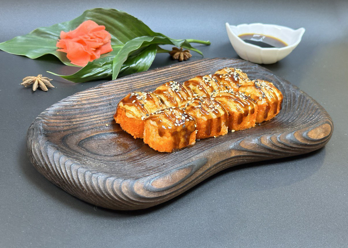 Вес 275 гр. Нежнейший запеченный ролл с филе лосося , крабом(сурими),в икре масаго сливочным сыром с аппетитной сырной шапочкой политой соусом унаги.