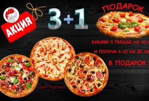 Закажи 3 пиццы и получи еще одну в подарок! При заказе трех больших пицц на 40 см. четвертая на 30 см. в подарок.(Акция действует только при самовывозе,другие акции и скидки не действуют.)