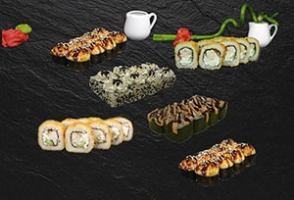 48 шт. Состав:Запеч. с Лососем терияки,Запеченный Томаго с чеснчком,Темпура Фиш Темпура Краб,Темпура Бекон ФРИ, Темпура.с Курицей Фри.