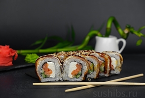 Вес: 340/240 гр. Известный ролл с мягким сливочным сыром, хрустящим огурчиком и лососем. Накрыт вкуснейшим жареным угрем, и украшен соусом «Унаги» с кунжутом.