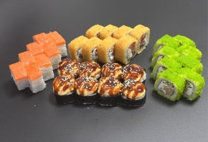 32 шт. Вес 1 кг Состав: Филадельфия Лайт, Грин Фиш,Запеченный с крабом,Темпура Магуро.