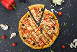 Вес: 1340/955/1055 гр. Томатный соус, свежие помидоры, маринованные корнишоны, лук,копченый цыплёнок, маслины,сыр Моцарелла и конечно же соус Барбекю.