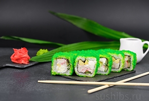 Вес: 315/210 гр. Классический ролл с авокадо, сливочным сыром, с сурими (имитация снежного краба). Покрыт яркой икрой летучей рыбы.