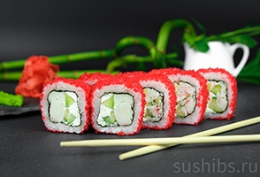 Вес: 315/210 гр. Классический ролл с авокадо, сливочным сыром, сурими (имитация снежного краба). Покрыт яркой икрой летучей рыбы.Внимание!(цвет икры может меняться).