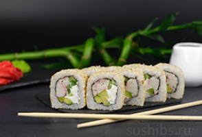 Вес:300/220гр. Оригинальный ролл в белом кунжуте с авокадо, сливочным сыром, с сурими (имитация снежного краба).