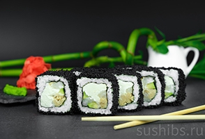 Вес: 315/210 гр. Оригинальный ролл в чёрной масаго. Спелый плод авокадо, сливочный сыр, сурими (имитация снежного краба) создают нотку соблазна.