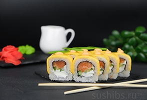 вес:330/225гр.Филе лосося,хрустящий огурчик,нежный сливочный сыр,с верху украшен сыром и спайси соусом и зеленым лучком.