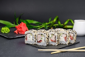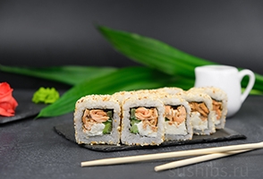 Вес: 300/230 гр. Жареный лосось в соусе «Терияки», нежным сливочным сыром и хрустящим огурчиком. Ролл сверху посыпан кунжутом.