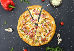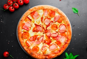 Вес: 1120/710/810 гр.+- % Эта пицца не оставит Вас равнодушными Фирменный томатный соус, сервелат, бекон, курица, ветчина,помидоры и сыр моцарелла.