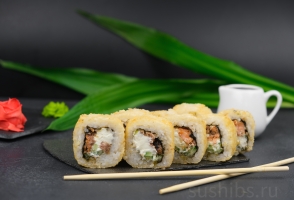 Вес: 340/240 гр. Фри-ролл с лососем запеченным в соусе терияки на гриле и свежим огурчиком в сочетании со сливочным сыром.
