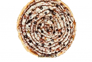 Томатный соус, свежие помидоры,корнишоны маринованные,нежный цыплёнок,свежие томаты,маслины, соус Барбекю и сыр Моцарелла.