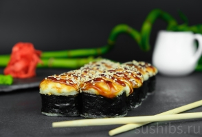 Вес: 420/270 гр. Запеченный ролл под сырной шапкой с нежным тунцом, сливочным сыром, болгарским перчиком и японским омлетом.