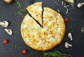 Вес: 1030/750/850 гр. Всеми любимая ароматная пицца. Никого не оставит равнодушным. Белый фирменный сливочный соус в компании с нежными сырами четырёх сортов на тонком, душистом тесте!