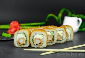 Вес: 350/260 гр. Фри-ролл с ароматной тигровой креветкой, тающим сливочным сыром, спелым и хрустящим огурчиком.