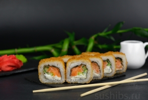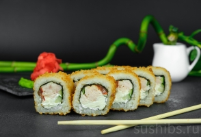 Вес: 340/245 гр. Фри-ролл со свежим лососем, тающим сливочным сыром, спелым и хрустящим огурчиком.